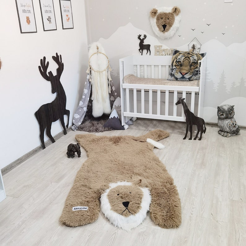 Khám phá thảm sư tử thủ công, một món đồ trang trí độc đáo cho phòng nursery của bé, mang đến không gian safari đầy thú vị. Thảm được làm từ vải minky mềm mại, có lớp nền polyester chắc chắn và lớp bông polyester giúp tạo sự êm ái, thoải mái. Với thiết kế hình sư tử dễ thương, thảm này hoàn hảo cho phòng bé trai hoặc phòng nursery theo chủ đề rừng nhiệt đới. Thêm vào đó, bạn có thể cá nhân hóa thảm với tên của bé để tạo nên món quà lưu niệm độc đáo. Đây là lựa chọn tuyệt vời cho những ai yêu thích sự khác biệt và muốn tạo không gian ấm cúng cho bé.